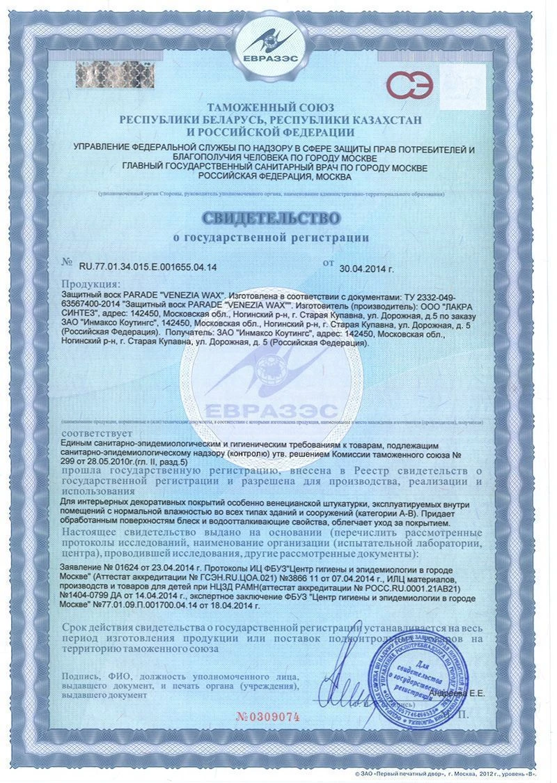 Водная восковая дисперсия, акриловая дисперсия, вода, целевые добавки: этиленгликоль, загуститель, пеногаситель, диспергатор, консервант, фунгицид.