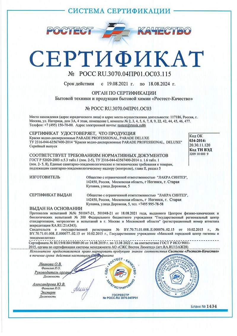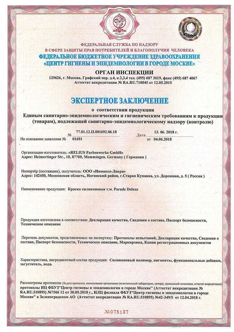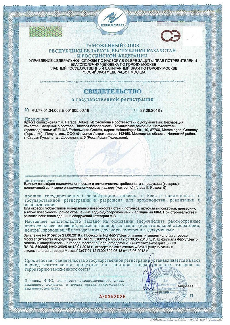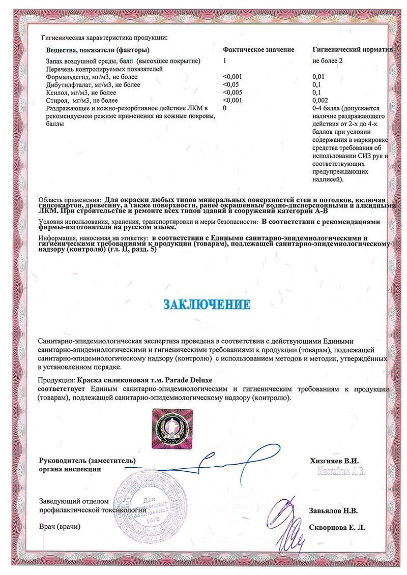 Краска соответствует строгим нормам безопасности и экологичности, позволяет использовать помещения сразу после ремонта.