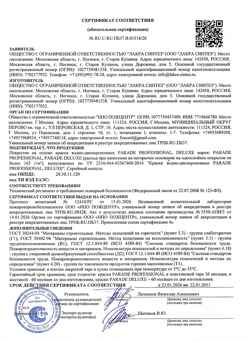 Срок годности, гарантийный срок хранения в оригинальной закрытой таре - 5 лет со дня изготовления. Хранить в оригинальной плотно закрытой таре, предохраняя от влаги и прямых солнечных лучей, при температуре от 5°С до 35°С. Продолжительность транспортировки при температуре ниже 0°С – не более месяца при условии, что число циклов замораживания/оттаивания будет не более 5. В случае замораживания, краску размораживают при комнатной температуре и тщательно перемешивают.