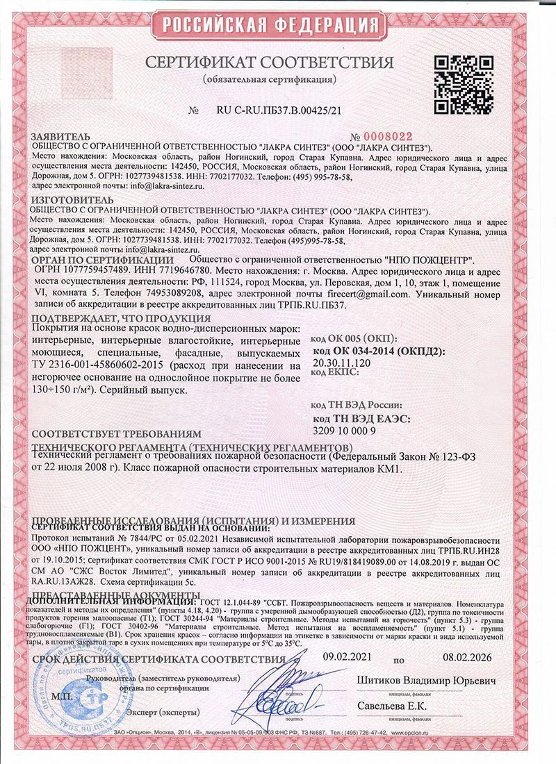 Акриловая водно-дисперсионная фасадная краска. Образует паропроницаемое матовое покрытие, устойчивое к атмосферным воздействиям, УФ лучам, перепаду температур, влаге. Обладает высокими декоративными свойствами, отличной укрывистостью и прочным сцеплением с основанием. Выдерживает частое мытье и сильные эксплуатационные нагрузки. Сертифицирована для применения в детских и лечебных учреждениях.