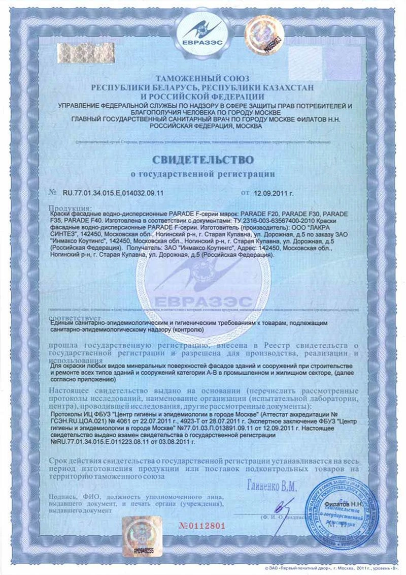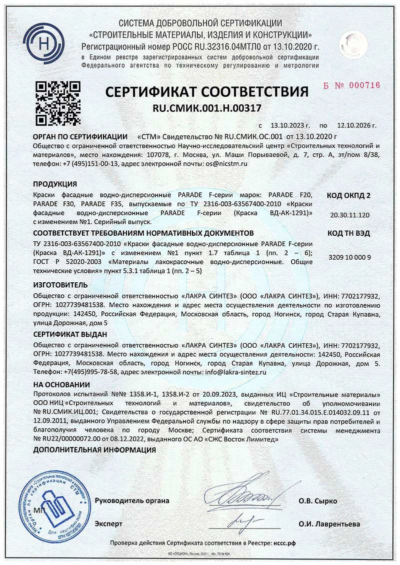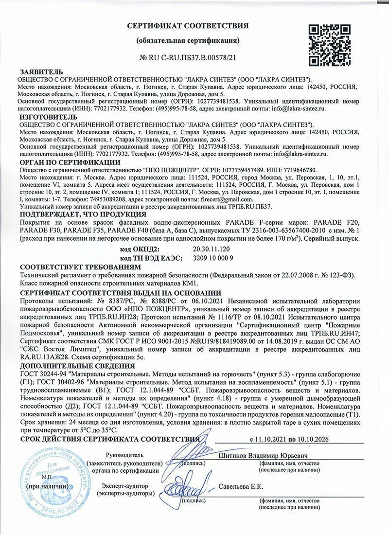 Акриловая водно-дисперсионная фасадная краска. Идеально подходит для фасадных поверхностей, подверженных влиянию избыточной влажности, для образования износоустойчивых внутренних покрытий. Допускается применение для окраски изделий из дерева, эксплуатируемых внутри помещений. Образует покрытие с отличной атмосферостойкостью, влагостойкостью, паропроницаемостью. Выдерживает частую влажную уборку и сильные эксплуатационные нагрузки. Допускает толстослойное нанесение (до 0,5мм).