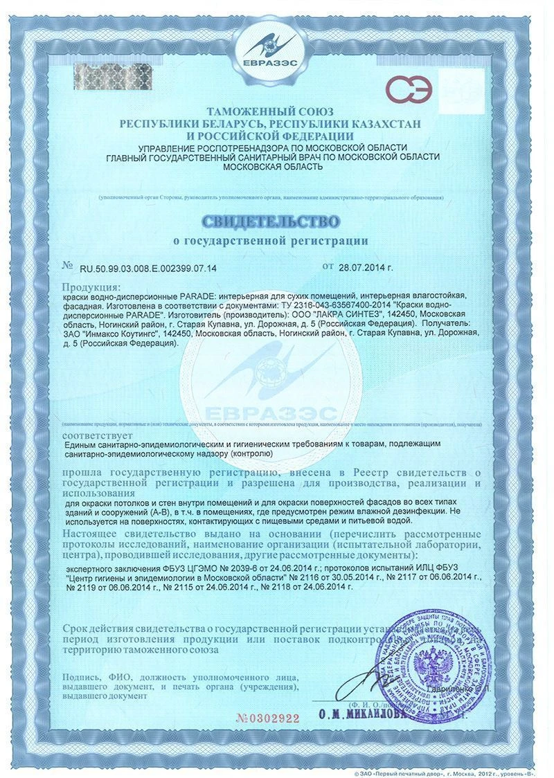 Хранить в оригинальной плотно закрытой таре при температуре от 5°С до 35°С. Срок годности, гарантийный срок хранения – 2 года со дня изготовления. Допускается транспортировка краски при температуре до минус 35°С.