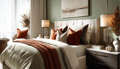 Огненные акценты на фоне изумруда — это палитра для смелых решений, добавляющая интерьеру выразительности