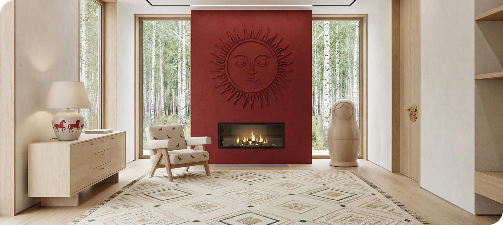 Оттенки брусники, хвои и тумана создают природную гамму, наполняя пространство уютом и гармонией