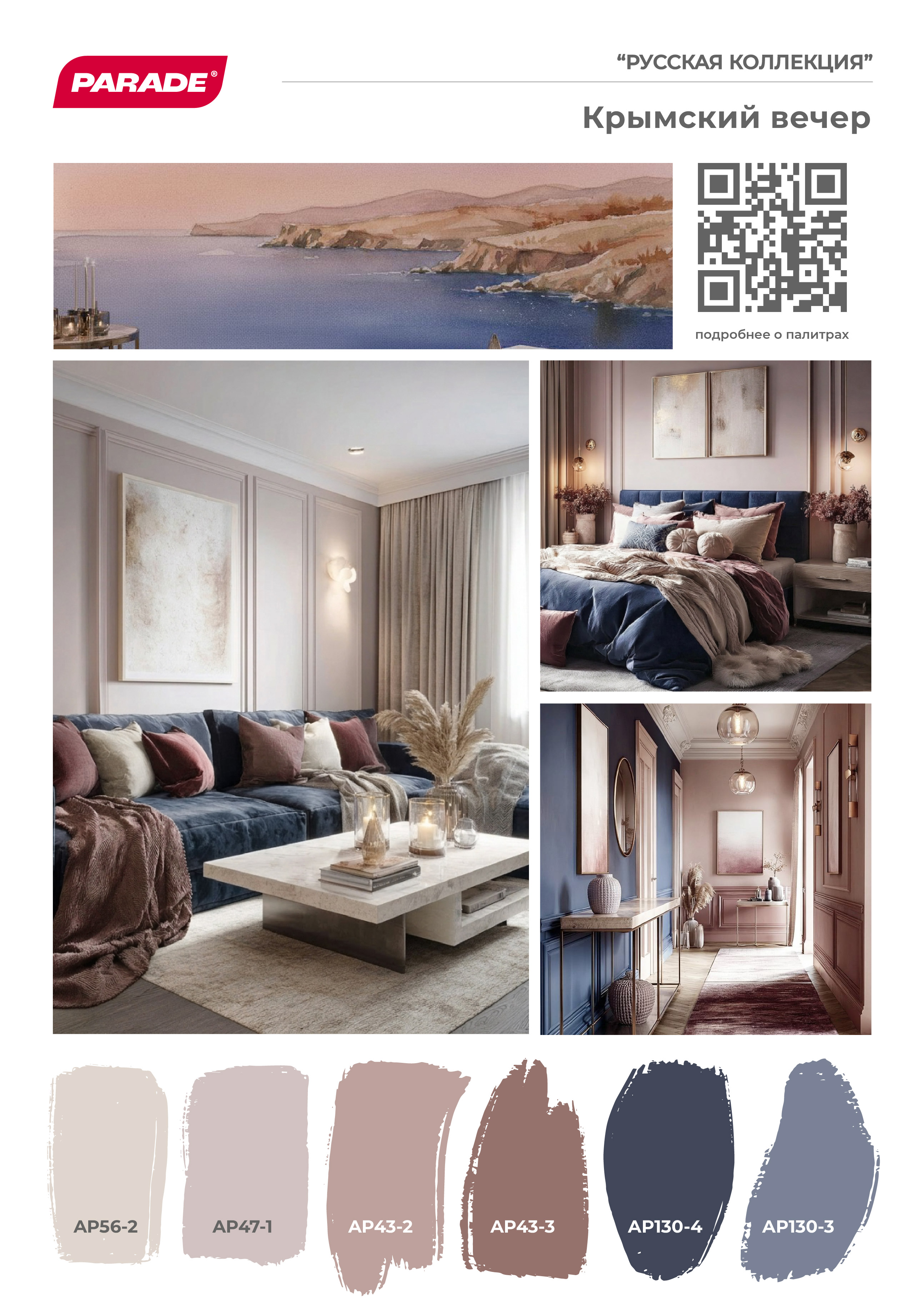 Палитра предстает перед нами в тёплых закатных оттенках крымского побережья. Сочетает глубокие тёмно-синие с нежными бежево-розовыми акцентами и тёплым терракотовым. Создаёт атмосферу уюта и лёгкой романтичности, напоминает о спокойствии вечернего моря. Идеальна для гостиных и спален в неоклассическом или бохо-стиле.