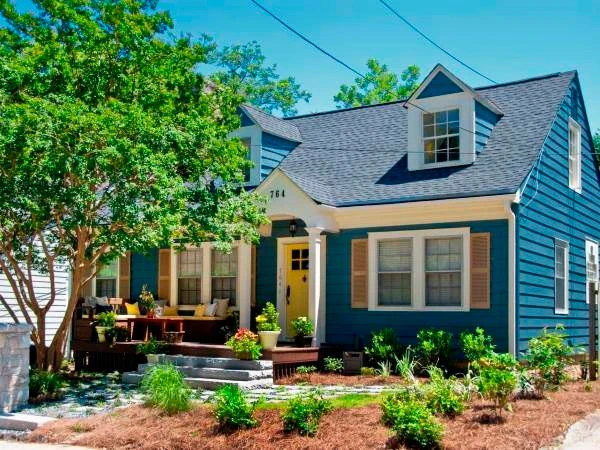 - Хотите покрасить свой дом в необычный цвет, который любите, но не знаете, с чем его сочетать, тогда просто выберите оттенок, который будет на пару тонов светлее или темнее основного на цветовом круге. А изюминкой вашего экстерьера станет входная дверь, покрашенная в контрастный цвет.