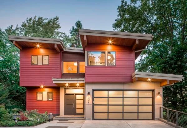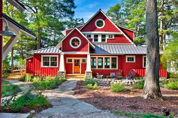 - Глубокие рубиново-красные оттенки, полюбились дизайнерам фасадов не только за свой роскошный вид, но и за умение сочетаться с зелеными растениями, окружающих большинство частных домов. Красный и зеленый являются противоположными на цветовом круге, и обеспечивают наибольший контраст по отношению друг к другу. Если ваш дом имеет интересную форму, которую стоит подчеркнуть, покрасьте его в цвет, который будет дополнять окружающий ландшафт.