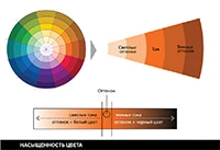 Цвет может быть светлее или темнее. Другими словами, цвет имеет насыщенность. Чтобы показать насыщенность, цветовой круг имеет несколько колец; два больших кольца для темных оттенков и два маленьких для светлых.
